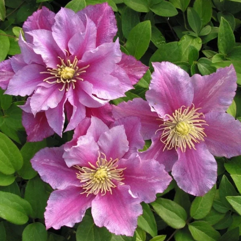 The 4-6" (10-15cm) flowers open light violet fading to sky-blue. The long bloom time combined with abundant flowers make this a favourite to many clematis enthusiasts. Mature height 9-12' (3-4m). Pruning group C.