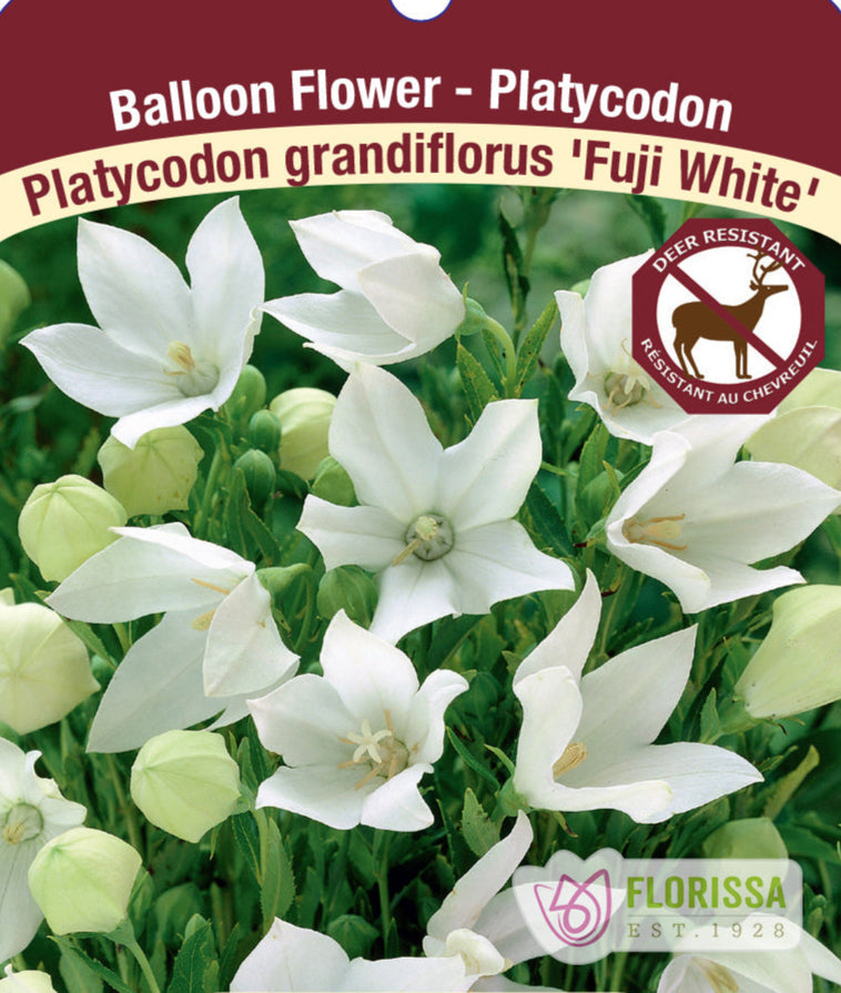 A graceful perennial, the Fuji White balloon flower unfolds pure white, star‑shaped blooms—about 2 inches (5 cm) across—atop upright stems ranging from 12 to 24 inches (30–60 cm) tall. These elegant flowers appear in small clusters or singly from June through August in gardens with full sun to part shade, providing a beautifully bright splash in mid- to late summer. It thrives in rich, well‑drained soil, but avoid overly moist conditions to reduce the risk of root rot. Low maintenance, deer-resistant, and with minimal pest issues, Fuji White is perfect for borders, rock gardens, edging, or containers.