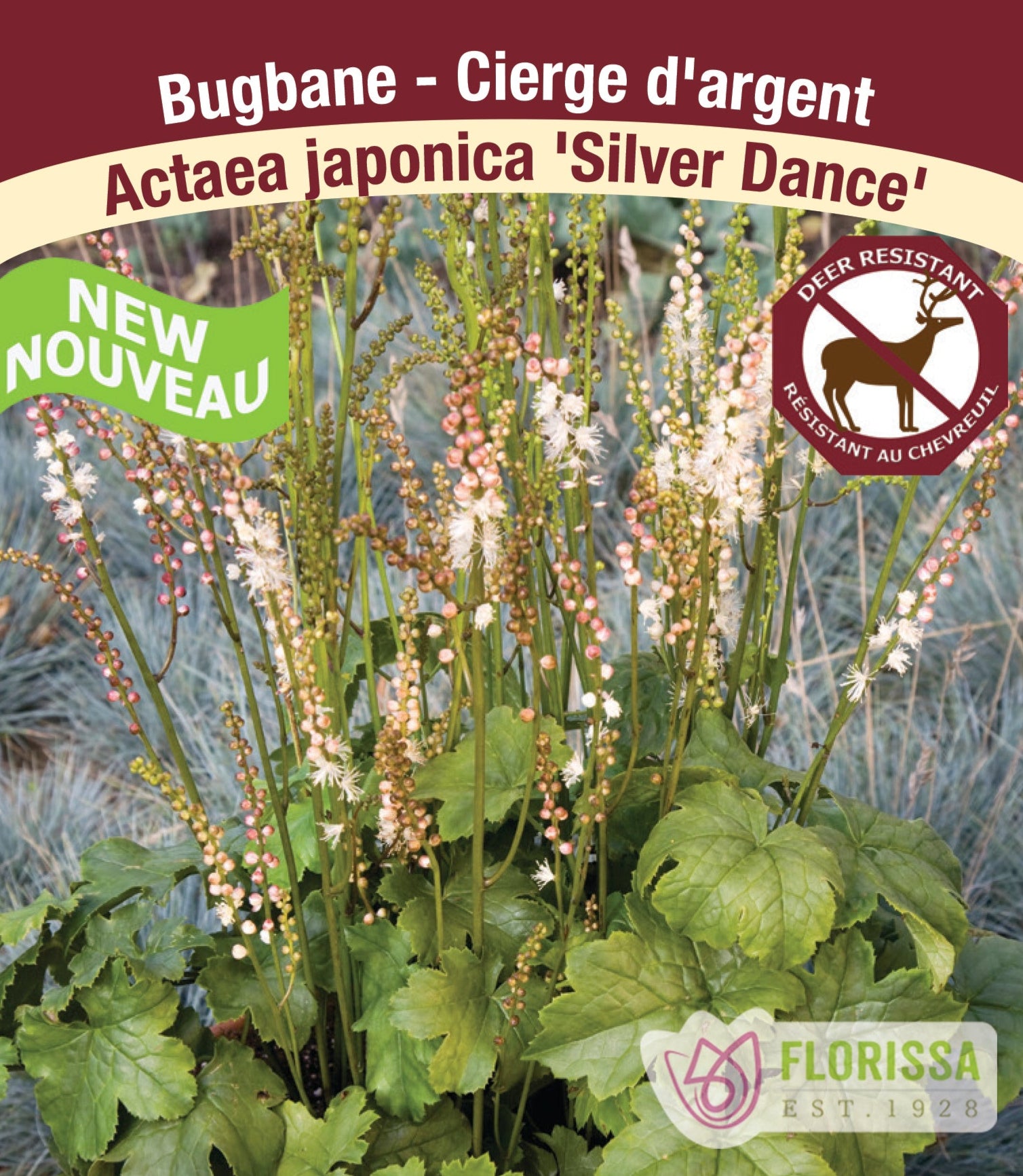 Graceful mounds of silvery-green foliage with contrasting red-purple veins provide a stunning display throughout the growing season, turning to fresh green by midsummer. From mid-summer to early fall, upright black stems bear fragrant, creamy-white bottlebrush flower spikes that softly elongated, offering a delicate, airy presence in shaded garden settings. Tolerant of moist, humus-rich soil in partial sun to shade, Silver Dance matures into a compact shrub-like bugbane ideal for woodland borders and shade gardens. Naturally deer- and rabbit-resistant and a magnet for bees and butterflies, it’s an elegant and resilient choice—but note, all parts are toxic if ingested, so handle with care.