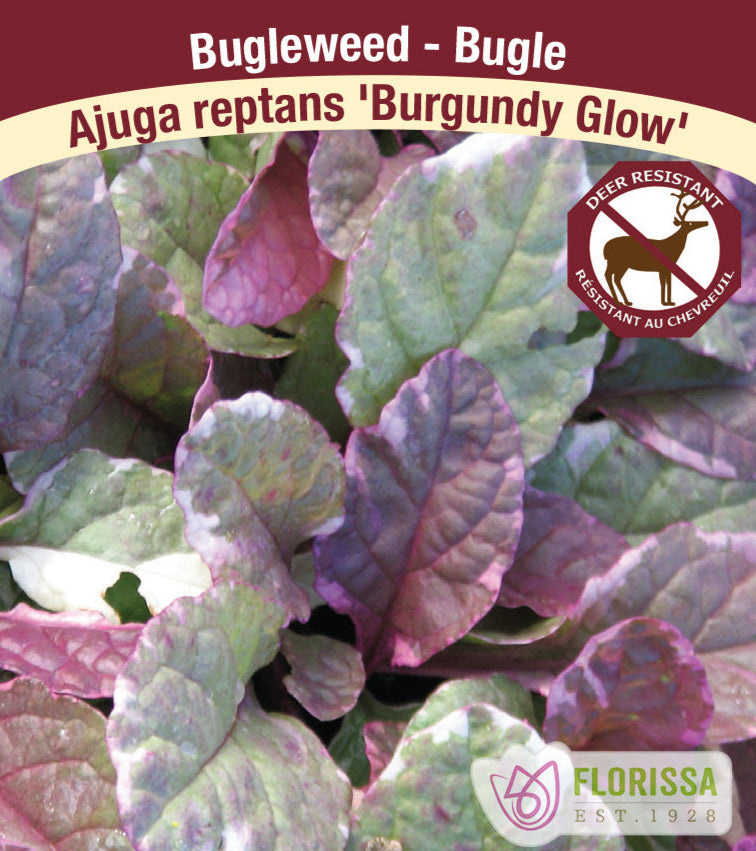 Ajuga reptans ‘Burgundy Glow’ is a captivating evergreen groundcover prized for its tricolored scalloped leaves—emerging burgundy in spring, fading to green with creamy-white variegation and smoky pink accents—topped with delicate spikelets of sky‑blue flowers in mid‑to‑late spring. It forms an attractive low mat about 4–6 in (10–15 cm) tall and spreads to 12–18 in (30–45 cm), making it ideal for edging, containers, rock gardens, or under trees. Hardy from zones 3–10, ‘Burgundy Glow’ thrives in part to full shade with average moisture, and it’s both deer‑ and rabbit‑resistant. It naturalizes slowly but beautifully, suppressing weeds, attracting bees, butterflies, and hummingbirds, and delivering year‑round color—even in winter.