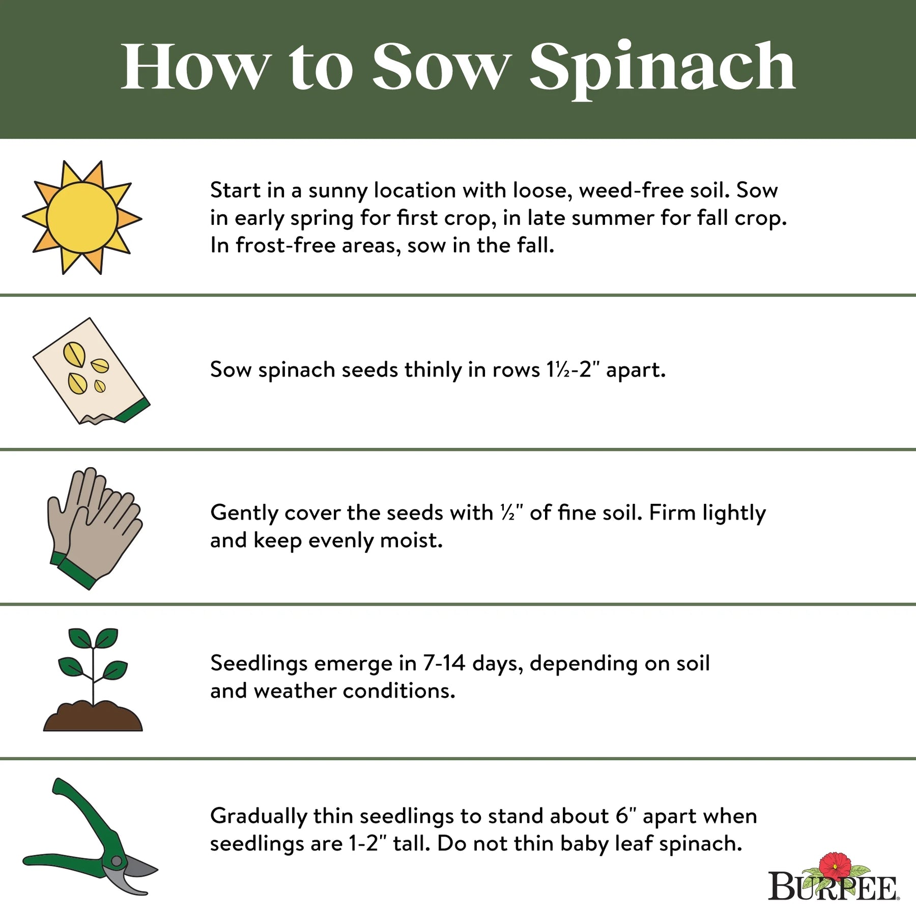 Sow in average soil in early spring for the first crop, again in late summer for a fall crop. Sow thinly in rows 46-61cm apart. Cover with 1 cm of fine soil; firm lightly and keep evenly moist. Seedlings emerge in 7-14 days. Thin to stand about 15 cm apart when seedlings are 2.5-5cm high.