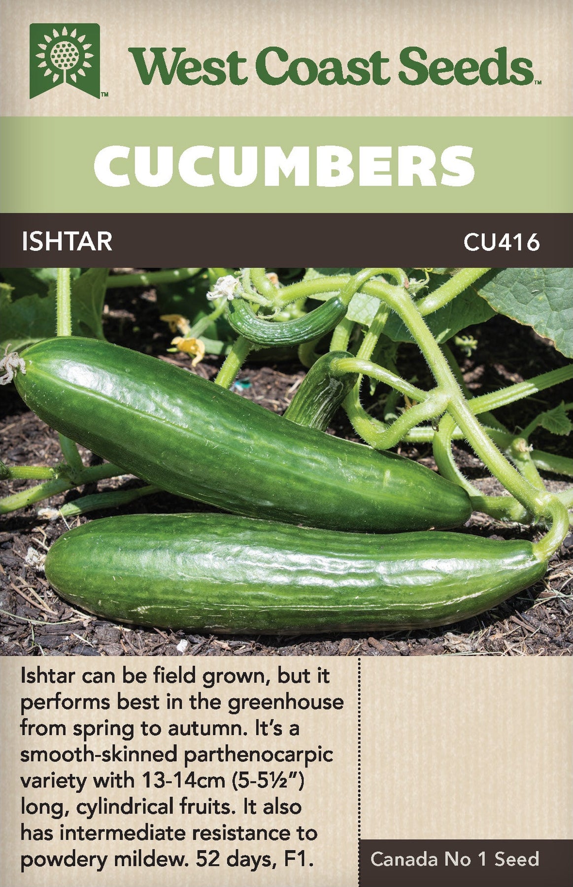 Ishtar can be field grown, but it performs best in a greenhouse from spring to autumn. It was very productive for us in raised beds. Ishtar is a smooth-skinned, parthenocarpic, Beit Alpha type, so it does not require pollination to produce its seedless fruits. If pollination occurs (if it is not isolated, or if it's grown outdoors), seeds may develop. The plants are vigorous and strong, with 13-14cm (5-5½”) long, cylindrical fruits. This variety also boasts intermediate resistance to Powdery Mildew, so it’s great for coastal growers who seem to experience this cucumber disease every summer.