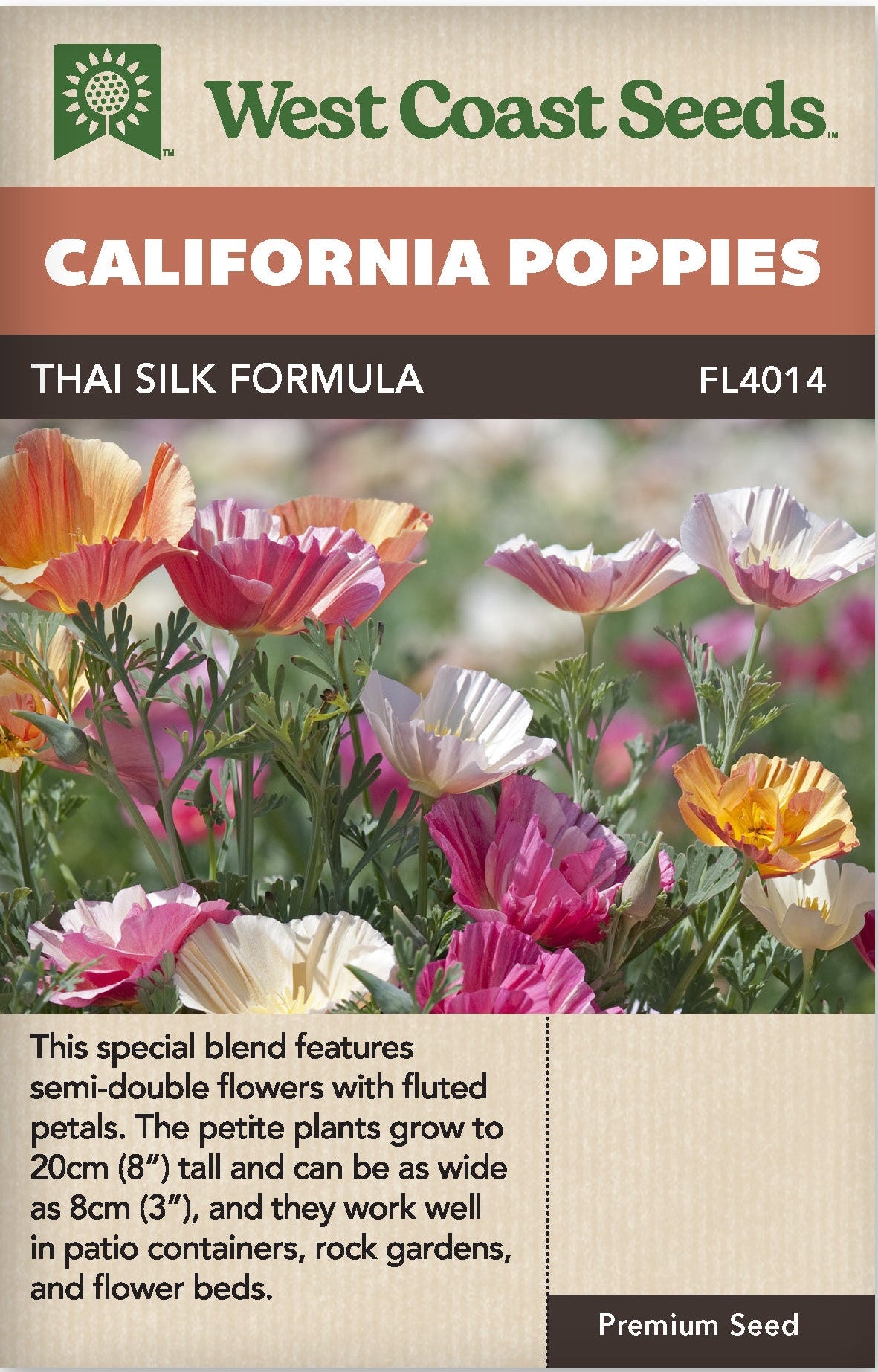 XL Jelly Beans is a new California poppy that features very large, semi-double blooms that feature splashes of bubblegum pink, lemon yellow, and raspberry red. These contrast beautifully against the feathery foliage with its restrained, matte silver-blue colour. The eye-catching flowers appear over a long period from spring through summer, and work well in beds or containers. XL Jelly Beans grows to about 25cm (10") tall, and is somewhat drought tolerant. It's also deer resistant.