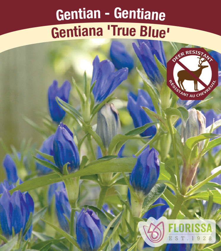 A standout for midsummer to early fall, Gentiana ‘True Blue’ features an array of pure, tubular royal-blue flowers measuring about 5 cm (2 in) long that bloom from the stems’ base to tip. Standing tall at 60–75 cm (24–30 in) with a tidy spread of 30–45 cm (12–18 in), its glossy green lance-like foliage provides a sculptural backdrop. Hardy in zones 4–8, this deer‑resistant, well-branched perennial thrives in moist, well‑drained soils with full sun to part shade. It draws butterflies—and occasionally hummingbirds—while adding distinctive vertical color to mixed borders, rock gardens, or containers.