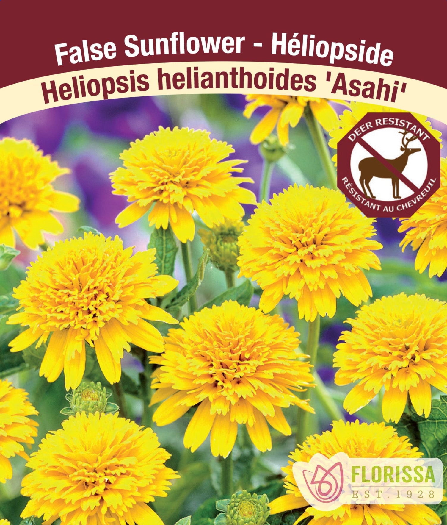 A vivid, double-flowered false sunflower that lights up the garden with pompom-style golden blooms. Forming a bushy clump of dark green foliage, it reaches approximately 28–36 in tall, producing masses of long-lasting flowers from early summer through fall. Heat, drought, and deer tolerant, this compact variety also thrives as a cut-and-come-again cut flower, attracting butterflies and bees. Easy-care and striking in borders, containers, or cottage gardens.