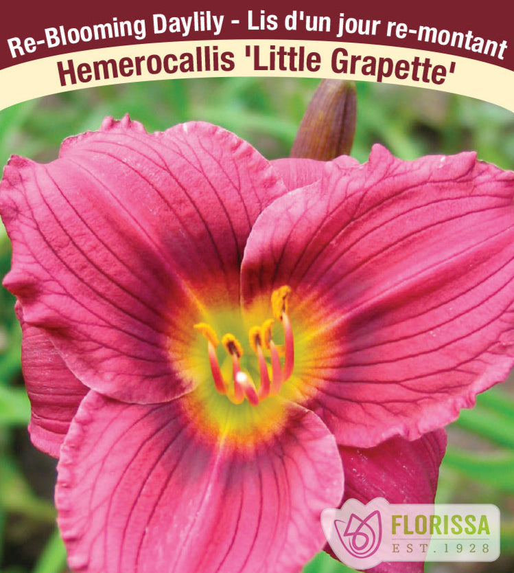 A charming miniature daylily, ‘Little Grapette’ offers captivating 2″ deep grape-purple trumpet-shaped flowers with black-grape bands, rose-purple watermarks, and a fluorescent green throat. Compact and semi-evergreen, it blooms in early mid-season (June–July) atop 12–18″ scapes from neat low clumps of foliage, making it an excellent choice for containers or front borders. Despite its petite size, it produces a high bud count and prolific blooms, attracting butterflies and hummingbirds while resisting rabbits and tolerating heat, drought, salt, black walnut, clay, and urban conditions.