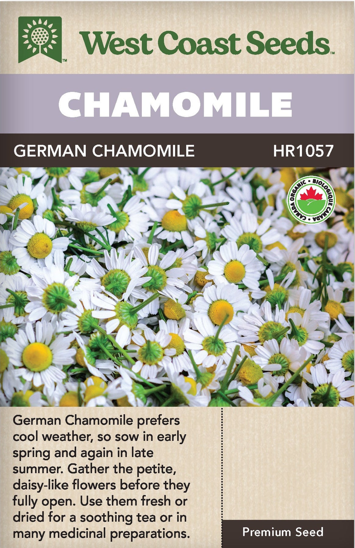 Organic German Chamomile Seeds are CERTIFIED ORGANIC petite daisy-like flowers that nod on a low plant. To better harvest the flowers, it is best grown in a bed by itself. German Chamomile prefers cool weather so sow in early spring and again in late summer. Gather flowers before they fully open. Fresh or dried, use them for a soothing tea or in many medicinal preparations. German Chamomile has a tendency to self sow but is easy to control and does not grow aggressively. It is highly attractive to bees, hoverflies, and other beneficial insects. The flowers are edible whole or simply with the petals sprinkled over salads. Our organic German Chamomile seeds can be used in xeriscaping as the plants are quite drought tolerant.