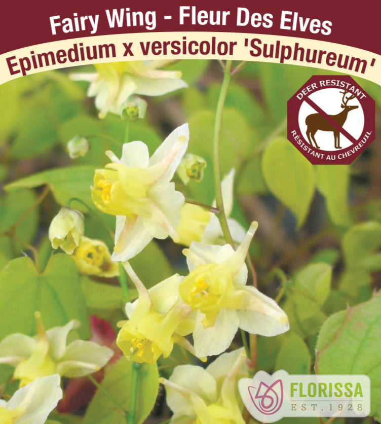 A versatile and vibrant woodland groundcover, Epimedium × versicolor ‘Sulphureum’ features heart-shaped foliage that emerges bronze-red in spring, matures to green, and returns to red in autumn, providing ornamental interest nearly year-round. In early to mid-spring, clusters of buttery-yellow, short-spurred flowers appear above the foliage on wiry stems, lighting shaded areas with a sunny glow. This rhizomatous perennial grows to about 20–30 cm (8–12″) tall and spreads 30–60 cm (12–24″), rapidly forming dense, semi-evergreen mats ideal for woodland, rock, or border plantings. Exceptionally low-maintenance, it thrives in part to full shade, tolerates drought once established, and is both deer- and rabbit-resistant, making it a gardener’s favorite for shade gardens.