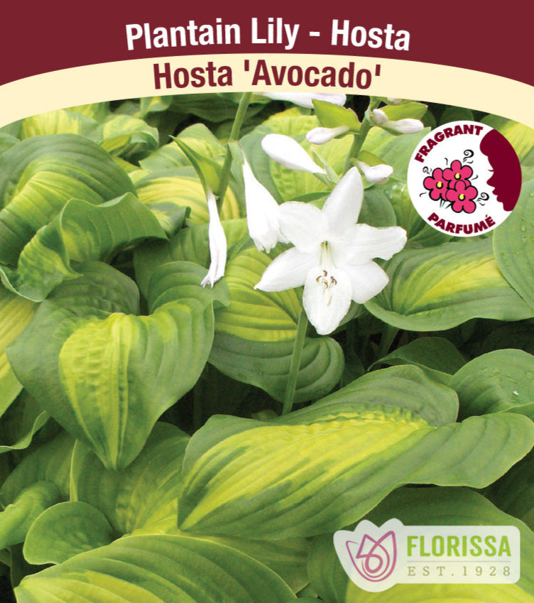 A striking shade perennial, Hosta ‘Avocado’ features large, glossy avocado-green leaves with wide dark-green margins, forming a lush mound ideal for specimen plantings or ground cover. It produces fragrant pale-lavender to white trumpet-shaped flowers on tall scapes in mid-summer, adding vertical interest to shaded beds. A sport of the popular ‘Guacamole’, this vigorous hosta is rabbit-resistant and thrives in Zones 3–9, tolerating part shade to morning/filtered sun, and is relatively drought-tolerant once established. With low-maintenance needs and fragrant blooms, ‘Avocado’ is a garden-friendly choice for woodland borders, containers, or cutting beds.