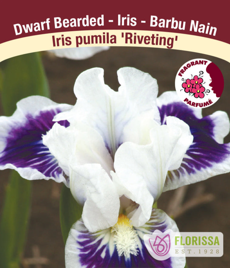 A standout dwarf bearded iris, ‘Riveting’ showcases pristine white standards complemented by deep inky blue‑purple falls with wide blended spots, accented by crisp white darts beside light yellow beards tipped in white. The intensely spicy fragrance adds a sensory spark to spring and early summer gardens. With tall slender foliage beneath, stems reach approximately 38 cm (15 in) high and 25 cm (10 in) wide in bloom, making it perfect for edging, rock gardens, or small-space plantings. Exceptionally cold-hardy to Zone 2, it thrives in full sun to part shade and grows best in well-drained soil—naturally deer- and rabbit-resistant.