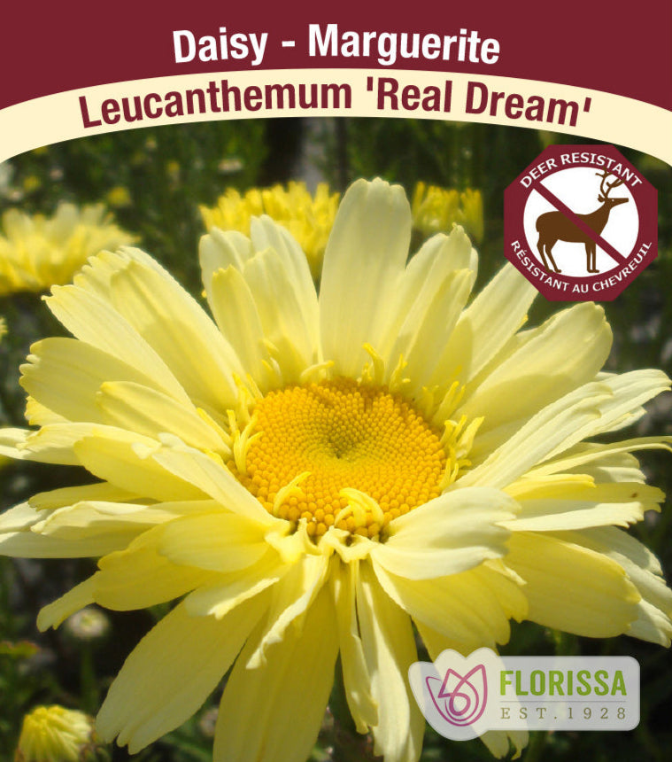 A charming and compact Shasta daisy, Leucanthemum × superbum ‘Real Dream’ lights up gardens with semi-double, greenish-yellow blooms that gradually fade to creamy white as they mature. The flowers, with multiple petal layers surrounding golden centers, appear atop sturdy upright stems from late spring through early fall, making this variety excellent for long-lasting cut blooms. Real Dream forms a tight, clump-forming mound about 16–18″ tall and 16–20″ wide, making it ideal for compact borders, containers, or mass plantings. This cultivar is disease-resistant, deer- and rabbit-tolerant, and consistently attracts butterflies throughout the season.