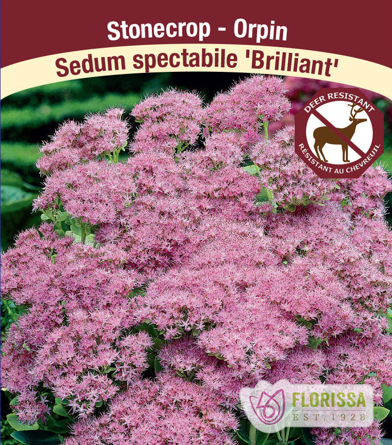 Sedum ‘Brilliant’ (also known as Hylotelephium spectabile 'Brilliant’ or Showy Stonecrop) is a standout perennial prized for its long season of elegant beauty. Upright and vigorous, it forms a neat clump of fleshy, grey‑green succulent leaves topped with flat, dinner‑plate‑size clusters of light pink star‑like flowers in mid to late summer. These blooms gradually shift to rust‑red and copper tones into fall, offering months of stunning visual interest—through winter, the dried flower heads continue to add structure and charm to the garden. A recipient of the Royal Horticultural Society’s Award of Garden Merit, ‘Brilliant’ is exceptionally hardy, drought‑tolerant, deer‑resistant, low‑maintenance, and a magnet for pollinators such as bees, butterflies, and hummingbirds.