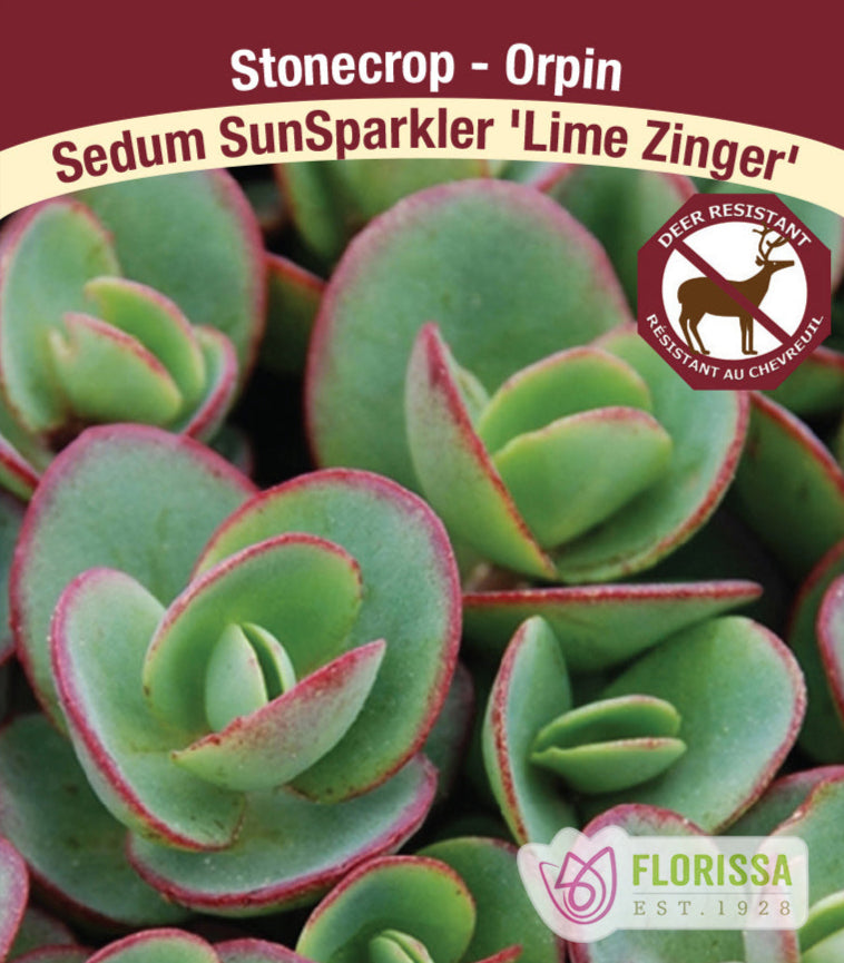 A vibrant and low-growing groundcover, Sedum SunSparkler® ‘Lime Zinger’ is known for its bright apple-green succulent foliage edged in bold cherry-red. This compact stonecrop forms a dense, weed-suppressing mat and crowns it with clusters of soft pink starry flowers from late summer into early fall. A tough, evergreen groundcover, it thrives in full sun and dry to medium, well-drained soils, making it a standout in rock gardens, containers, and borders.