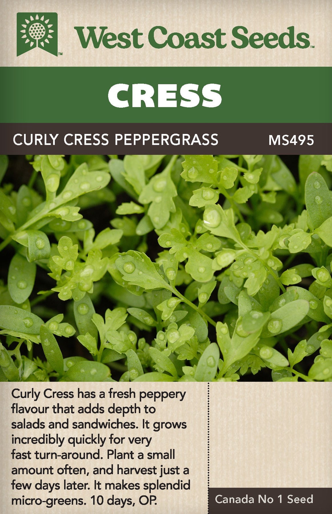 Fast-growing, frilly leaves leap out of the ground. A little cress really spices up a salad or sandwich. Plant a small amount of Curly Cress Peppergrass seeds frequently or grow indoors as microgreens in nearly any size of container. Curly Cress is a good seed to use in classroom settings because of its super sonic growth rate. The taste is mildly spicy and not too dissimilar to black pepper. It is a relative of both Watercress and the mustard family, and boasts a similar flavour profile. Cress is an incredibly rich source of vitamin C and K.