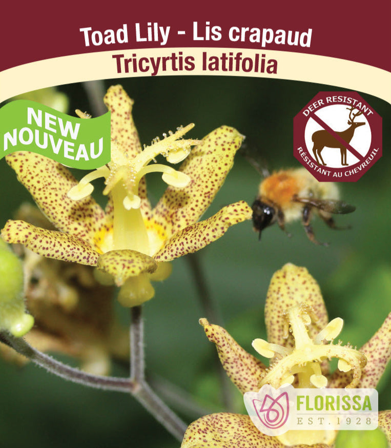A graceful choice for shade gardens, Tricyrtis hirta—commonly called Japanese Toad Lily—produces clusters of delicate, orchid-like flowers in late summer to early fall. Each pale lavender to white bloom is intricately freckled with deep purple spots and rises on arching stems above lush, lance-shaped leaves. This herbaceous perennial reaches around 60–90 cm (2–3 ft) in height and 30–60 cm (1–2 ft) wide, thriving in rich, consistently moist, acidic to neutral soil under partial to full shade. Relatively low-maintenance and deer-resistant, it also supports bees, butterflies, and hummingbirds in woodland or border settings.