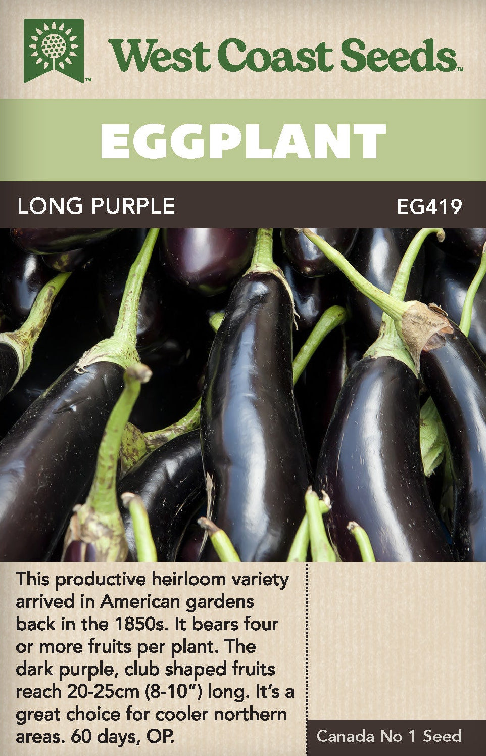 Sometimes listed as Fingerling or Long Purple Italian, Long Purple Eggplant seeds produce stocky, productive plants that bear four or more fruits per plant. The fruits are dark purple and club-shaped 20-25cm (8-10") long and around 6cm (2.5") in diameter. The flesh is firm and mild in flavour, and it's lovely when cooked, taking on the flavours it is cooked with. This old heirloom variety arrived in American gardens back in the 1850s. Try growing this eggplant in a three to five-gallon pot on your patio. Eggplants thrive in hot weather, and this variety does particularly well in northern areas.