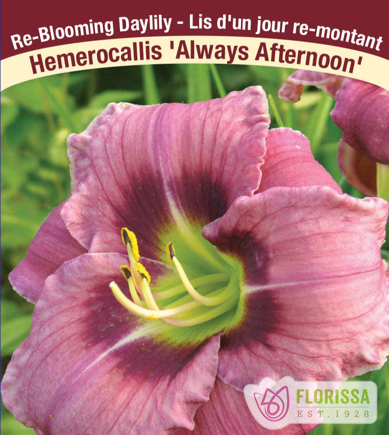 A stunning reblooming daylily, 'Always Afternoon' features large 5½″ raspberry-pink blooms with a deep plum-purple eyezone and vibrant green throat. Its crimped, piecrust-edged petals and smooth sepals open early summer, lasting at least 16 hours, and often rebloom later in the season. Growing to about 22 in tall with semi-evergreen foliage, it's both eye-catching and reliable from zones 3 to 9. A hardy, adaptable plant, it thrives in full sun to part shade in average, well-drained soils and is deer and rabbit resistant, while attracting butterflies and hummingbirds.