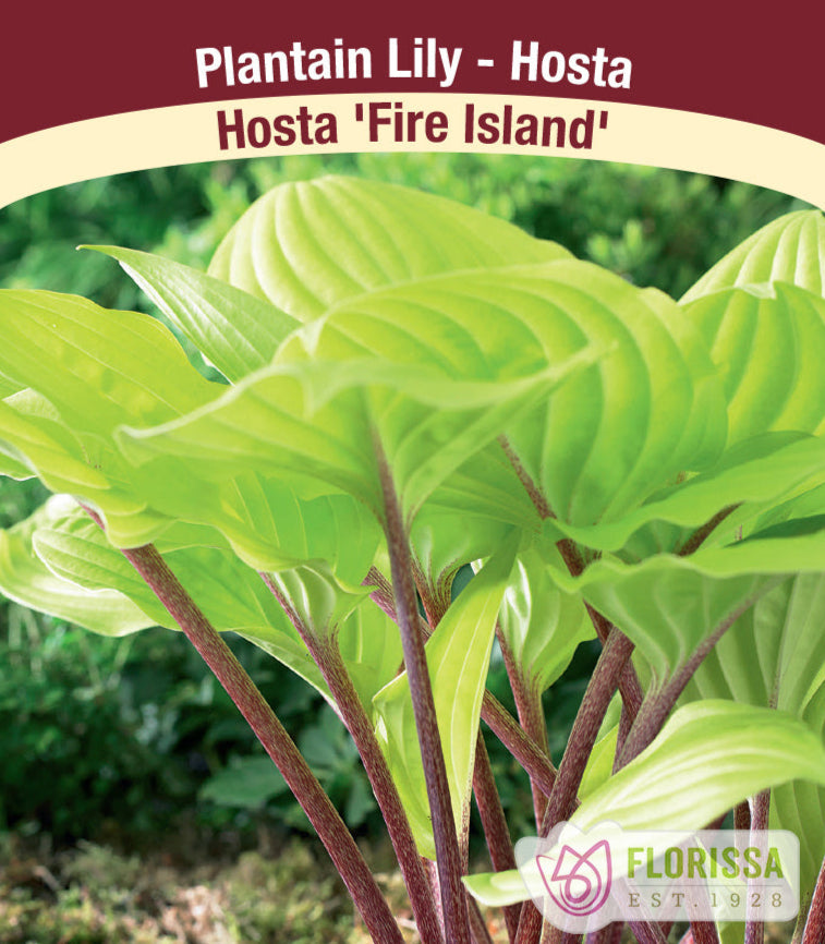 Bright and bold, Hosta ‘Fire Island’ brings a burst of golden foliage to shade gardens with chartreuse leaves on fiery red petioles, especially vivid in spring and early summer. As the season progresses, the foliage softens to chartreuse while the red petioles persist, creating eye-catching contrast. In mid-summer, slender scapes rise approximately 18 inches, adorned with pale lavender blooms that attract hummingbirds. Compact yet vigorous, this cultivar thrives in part to full shade in moist, well‑drained soil.