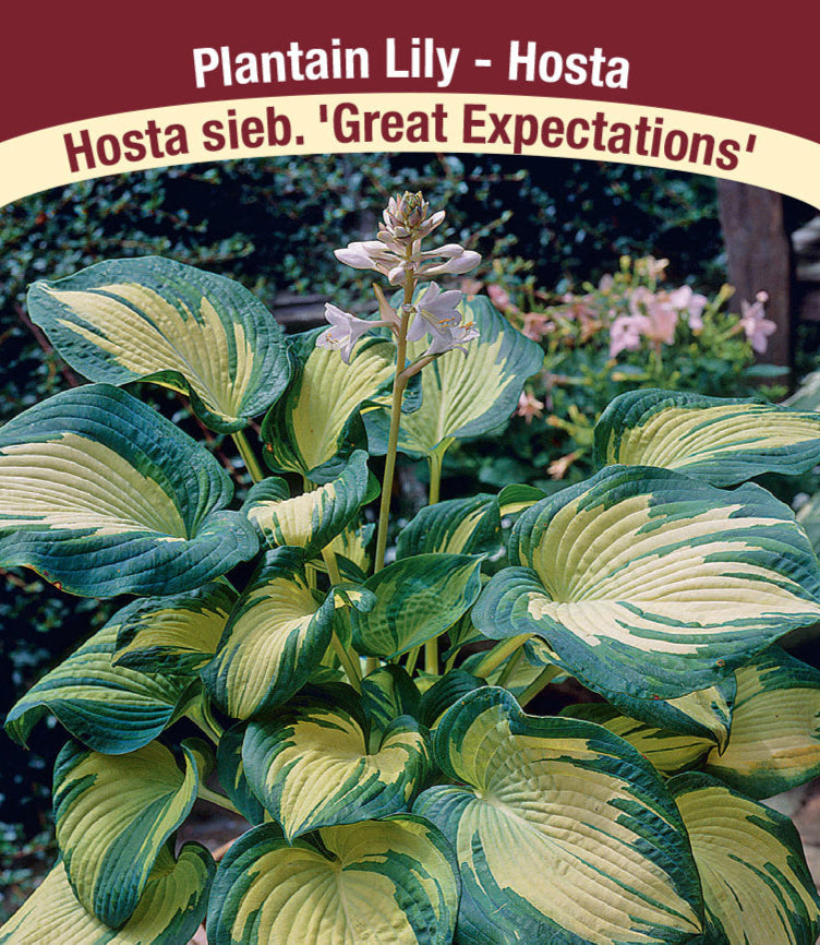 Hosta sieboldiana ‘Great Expectations’ is an elegant sport of ‘Elegans’ celebrated for its exceptionally bold variegated foliage. Leaves emerge chartreuse-gold in spring, gradually fading to creamy white, and are framed by wide, irregular blue-green margins streaked toward the center. Thick, puckered, heart-shaped leaves form a sturdy, upright mound ideal for shade gardens. In early to midsummer, tall scapes rise above the foliage, bearing fragrant near‑white bell‑shaped flowers that attract hummingbirds and pollinators.
