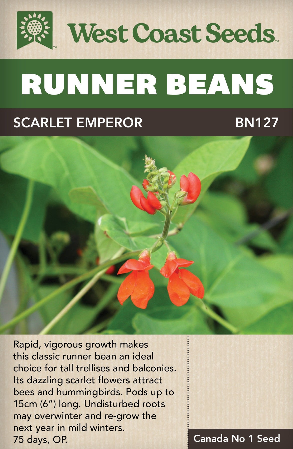 Scarlet Emperor runner bean seeds produce plants that have large clusters of beautiful scarlet flowers. Rapid, vigorous growth make the classic Scarlet Emperor an ideal choice for screens, trellises, and balconies, and they are highly attractive to hummingbirds. Its masses of long pods are tender and tasty when smaller. The pods just keep coming as long as the plants are carefully picked. Undisturbed roots may overwinter and re-grow the next May or June in warm winter areas. Seeds are black & purple. Grow Scarlet Emperor up a tall, strong trellis, and it will reach 3m (10') or higher in no time.