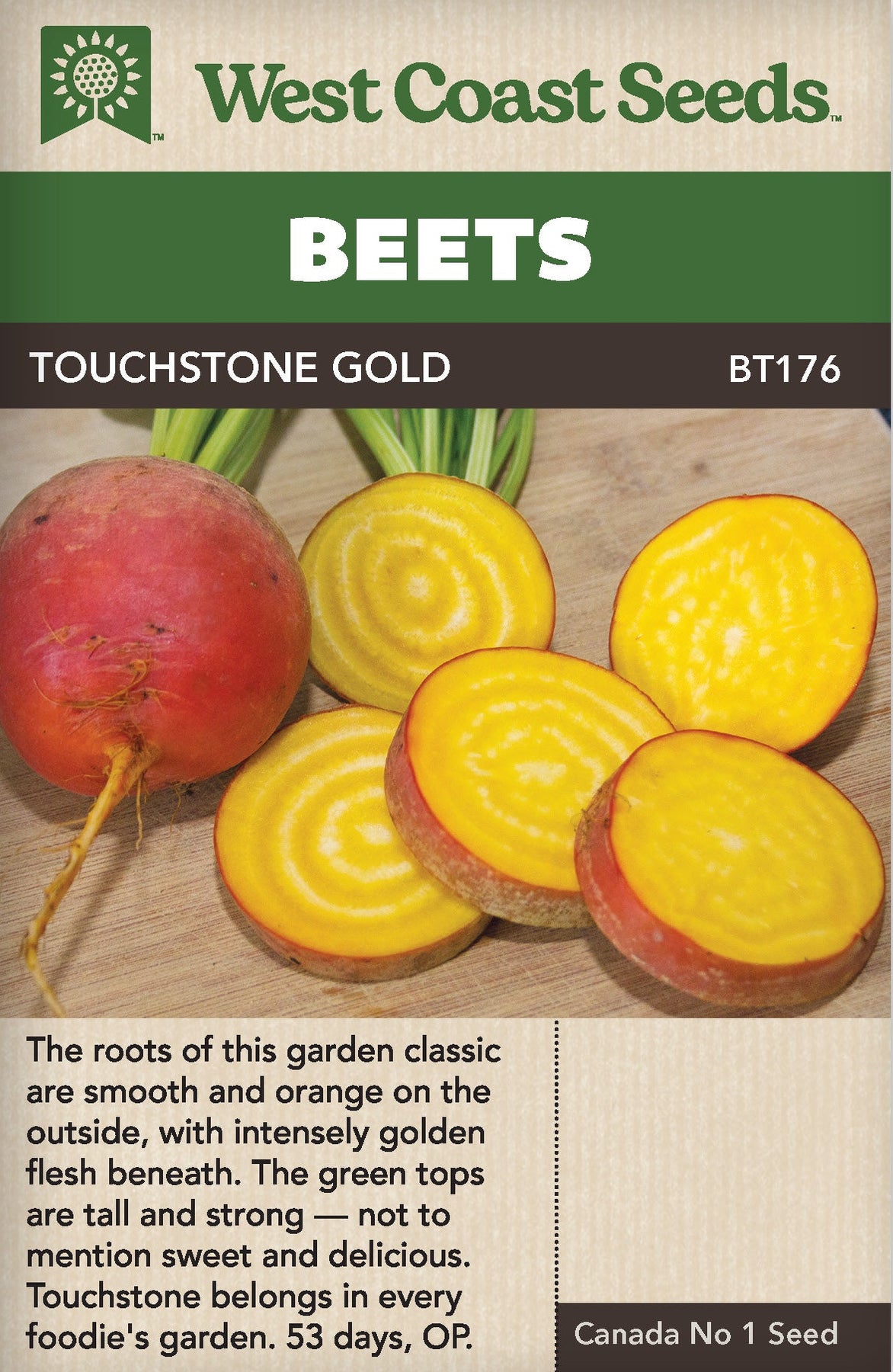 The beautiful bright colours of Touchstone gold are a table delight! Touchstone Gold beet seeds replace the Detroit Gold with a more vibrant yellow interior and red skin. The strong tops are green with green stems and pale golden petioles, while roots are a vibrant orange, uniformly globe-shaped, and very smooth; making a stunning display on the market table. Easy to grow, a favourite vegetable to direct sow for spring or fall. Sweet with a rich colour, these beets are delicious, roasted, steamed or baked. This has become a staff favourite, and has earned a place in every summer’s garden.