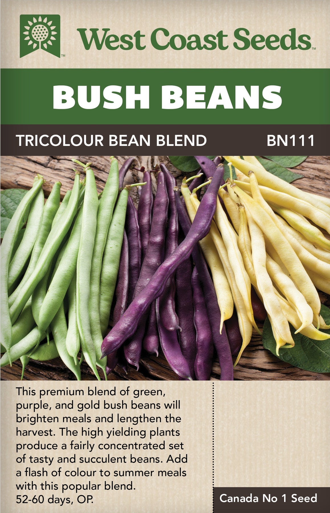 The Tricolour Bean Blend is our best selling bush bean. It incorporates three varieties of bush beans that will produce purple, gold, and classic green beans. Because of the variety, the harvest window is extended over several weeks. The plants are not huge, so they will work well in larger containers such as half barrels or grow bags. Or try some in raised beds or your organic vegetable garden. Take summer meals to a new level with this novel blend of multi-coloured bush beans. The pods are easy to pick and lovely to look at in the garden.