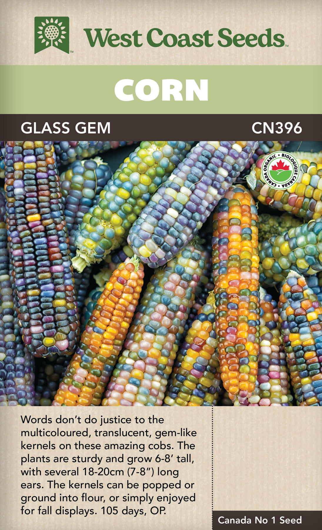 CERTIFIED ORGANIC! Oklahoma native Carl Barnes selected the stunning Glass Gem Organic corn seeds from several traditional heirlooms known for their beauty. Words don't do justice to the multicoloured, translucent, gem-like kernels on these amazing cobs. The plants are sturdy and grow 6-8' tall, with several 18-20cm (7-8") long ears. The kernels can be popped or ground into flour, but they're almost too beautiful to part with. Consider starting this one indoors, as it has a long maturation. The kernels take on these extraordinary colours as they dry so they make exceptional autumn displays. No two cobs are identical.