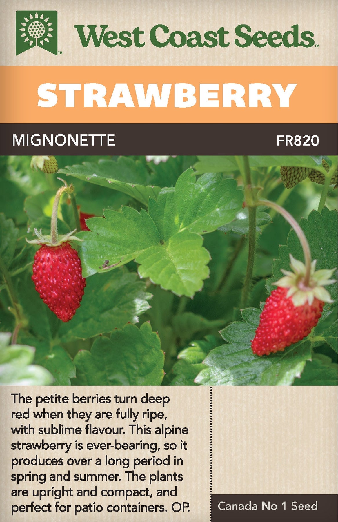 This French delicacy may be the perfect little strawberry. Mignonette alpine strawberry seeds produce fruits that grow bigger than most alpine strawberries.  Bright red, deliciously sweet, and easy to care for. The compact perennial plants form pretty little mounds that will bear strawberries the first year. Set them around the edges of the flower garden, in hanging baskets, and windowsill planters for easy picking.