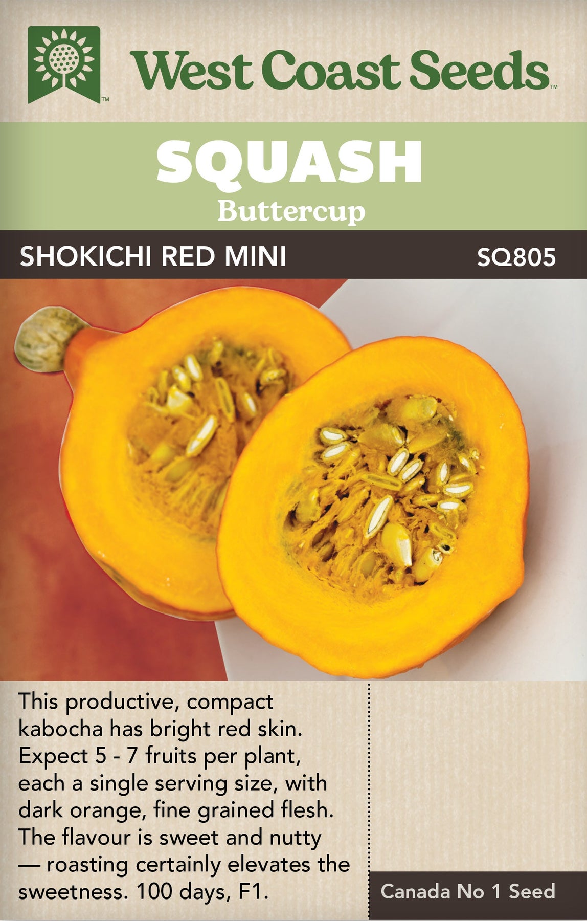 This productive, mini kabocha is a red-skinned version of Shochiki Green. Expect the same five to seven fruits per plant, only slightly larger, with dark orange, fine grained flesh. The flavour is sweet and nutty — roasting certainly elevates the sweetness. It pairs exceedingly well with other rich flavours like sage in browned butter, as well as sharp tastes like green apple and chardonay. Shokichi Red Mini Kabocha performed well in our summer field trials, not straying far from the planted row, and producing a large harvest of smallish kabocha fruits.